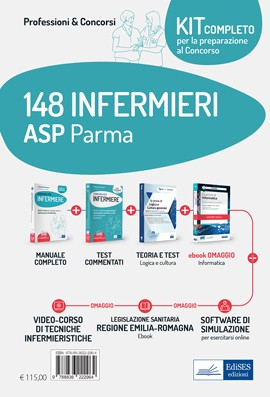 Il kit per la preparazione a tutte le prove del concorso per l'assunzione di 148 Infermieri presso l'ASP Parma e altre Aziende Sanitarie dell'Emilia Romagna (pubblicato sulla Gazzetta Ufficiale n.92 dell'11/12/2020) è composto da tre libri: