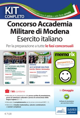 Il kit completo per la preparazione a tutte le fasi del concorso per l'Accademia Militare dell'Esercito di Modena contiene i seguenti libri: