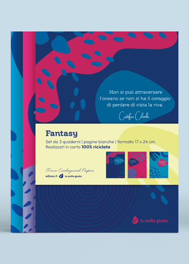 Il set di 3 quaderni Fantasy, formato 17x24 cm, con copertina flessibile è un prodotto 100% eco-sostenibile grazie all'utilizzo della carta riciclata.