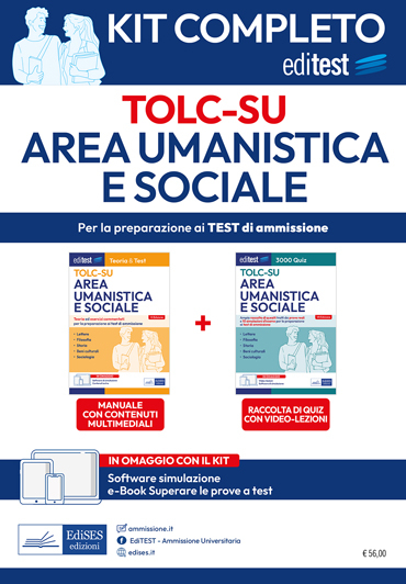 Il kit completo per la preparazione ai test di ammissione ai corsi di laurea di Area Umanistica e Sociale, compreso il TOLC-SU, contiene: